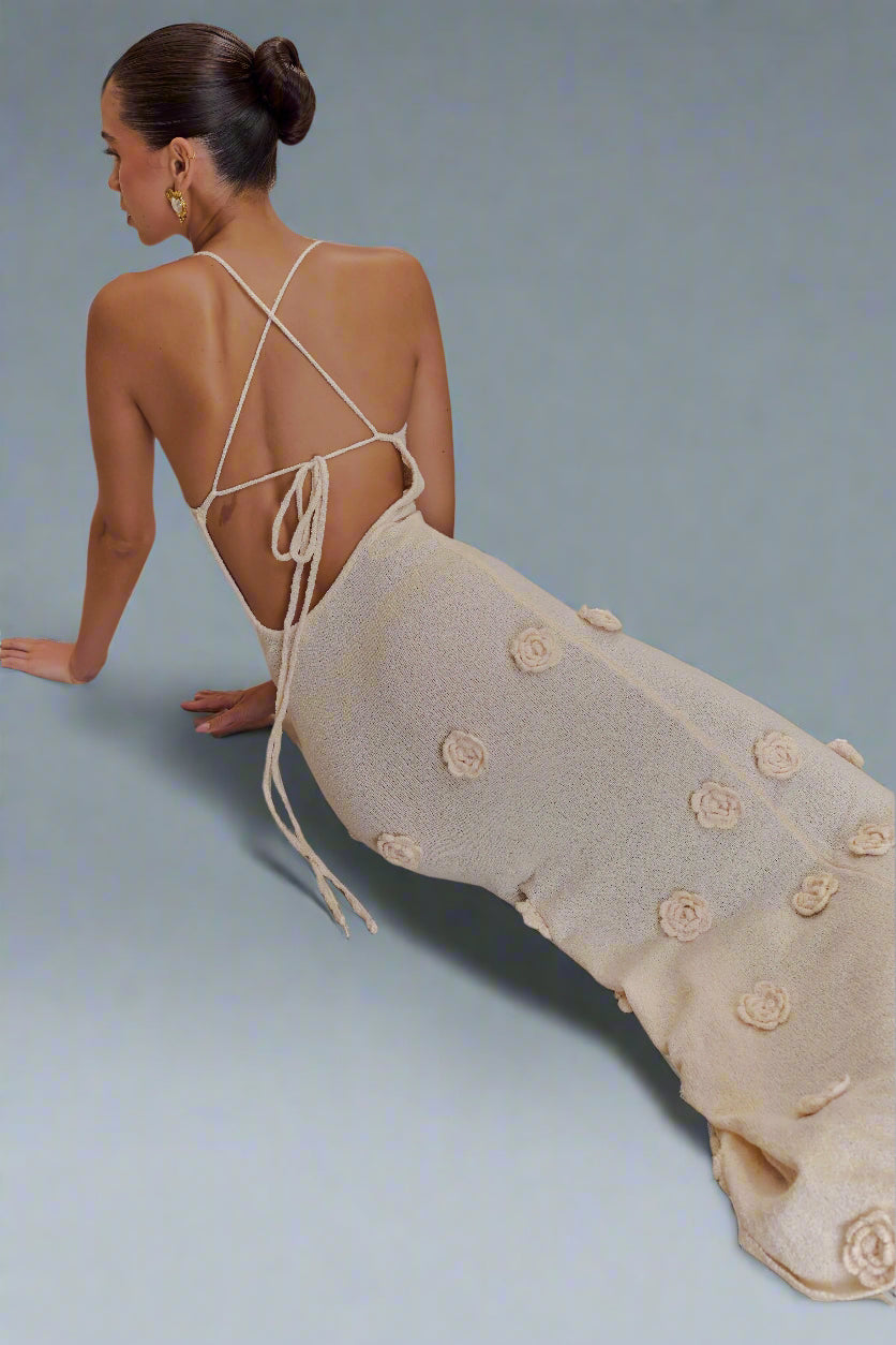 Romantic and bold, the Lily Crochet Maxi Dress features a flattering V neckline, crisscross straps, and a body-hugging fit. Finished with delicate flower appliqué, it’s the perfect choice for festivals, date nights, or summer soirées.