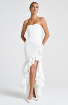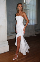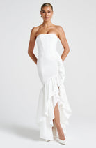 Embrace timeless elegance with the Angelina Maxi Dress in ivory. This stunning strapless maxi dress features an internal corset with boning, offering a sculpted, figure-flattering fit. Contour princess seams enhance your silhouette, while voluminous frills at the hem create a striking, feminine finish. Style it with strappy heels and delicate jewellery for an effortlessly chic look that exudes refined glamour.