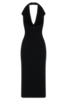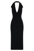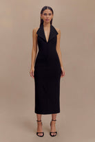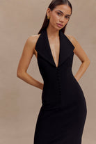 The ANNITA Crepe Halter Midi Dress exudes timeless elegance with its deep V neckline and halter design. Featuring a collared neckline and a button front (non-functional), this dress combines classic elements with a modern edge. The open back adds a touch of allure, while the fitted silhouette accentuates the figure gracefully. Crafted from luxurious crepe, the midi length offers a sophisticated and versatile option for any occasion, ensuring you make a stylish statement wherever you go.