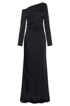 The AVERY Long Sleeve Maxi Dress features an asymmetrical drop shoulder neckline, adding modern sophistication. With long sleeves for coverage and grace, it boasts side gathered waist detailing for a touch of femininity. Lined for comfort, this dress ensures you look and feel your best for any elegant occasion.