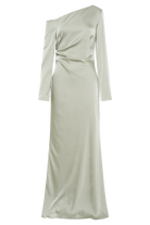 The AVERY Long Sleeve Maxi Dress features an asymmetrical drop shoulder neckline, adding modern sophistication. With long sleeves for coverage and grace, it boasts side gathered waist detailing for a touch of femininity. Lined for comfort, this dress ensures you look and feel your best for any elegant occasion.