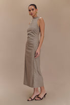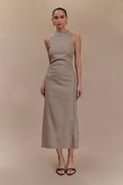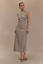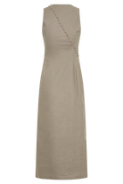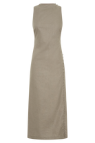 Elevate your style with the BRONTE Linen Button Midi Dress, a stunning blend of elegance and modern sophistication. This dress features a high neckline and a fitted silhouette that beautifully accentuates your figure, while the sleeveless design ensures a chic, contemporary look. The open button detail at the back cutout adds a playful twist, and the flattering midi length provides a refined touch. Fully lined for comfort, the dress also includes a button detail side leg split that introduces a hint of allure and ease of movement.