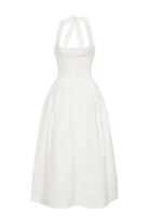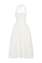 The CANDY Halter Midi Dress blends timeless elegance with modern sophistication. Its halter neckline and ruched bust detail create a flattering, sculpted look, while the corset boned bodice provides structure and shape. The defined waist enhances your figure, leading to a full, flowing skirt that moves gracefully with every step. Practical side pockets add an unexpected touch of convenience. With a midi length that exudes refinement, a zip closure, and a fully lined interior for comfort, this dress is the perfect choice for both special occasions and everyday elegance.
