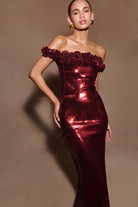 The CARRIE Sequin Rose Maxi Dress combines romantic elegance with dazzling glamour. Featuring an off-the-shoulder neckline adorned with a stunning rose detail, this dress makes an unforgettable statement. The fitted silhouette hugs your curves, while the shimmering sequin fabrication catches the light beautifully. Designed in a maxi length with a back skirt vent for graceful movement, it’s lined for comfort and finished with a centre back zip for easy wear. Perfect for formal occasions, this dress brings a touch of timeless beauty to any event.