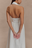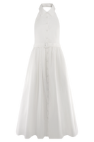 Step into timeless elegance with the CINDY Collared Midi Dress, a halter neck silhouette elevated by a sharp collar and cinched waist. The functional centre front buttons add a touch of vintage appeal, while the full gathered skirt flows effortlessly into a flattering A-line fit. Complete with a coordinating waist belt to define your shape, this dress is your go-to for polished days and dressed-up moments alike.