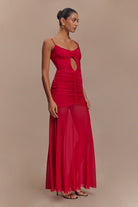 The DELANEY Slinky and Mesh Maxi Dress is the perfect balance of sultry elegance and effortless movement. Featuring a ruched bust detail and a daring front keyhole, this dress flatters the silhouette while adding a touch of intrigue. The jersey bodice offers a smooth, contoured fit, while the gathered front and back skirt details create soft draping for a feminine finish. The sheer mesh lower skirt adds fluidity and drama, beautifully complementing the adjustable straps for a customized fit. Designed in a maxi length, this dress is your go-to for events that call for modern sophistication with a hint of allure.