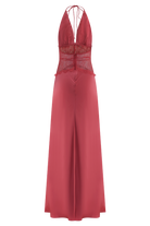 Turn heads in the DINAH Lace and Satin Maxi Dress, a romantic silhouette that blends soft textures with sultry details. Featuring a halter tie V neckline and softly gathered bust, this dress flows into a sheer lace body that skims the figure with ease. The low back adds a touch of drama, while the maxi length and invisible zip create a seamless finish. Partially lined for subtle coverage, this dress is the epitome of slip-on elegance with an irresistible edge.