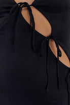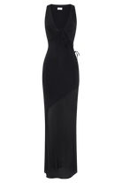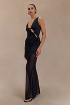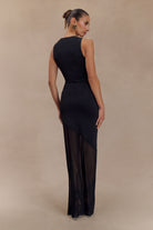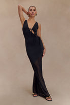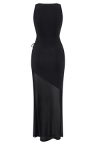 The DOVE Slinky and Mesh Maxi Dress is a stunning blend of sleek design and alluring details. Featuring a flattering V neckline and sleeveless cut, this dress showcases a bold front cutout with a delicate tie detail, adding an edgy twist. The asymmetrical panelling on the skirt creates a unique silhouette, while the mesh lower skirt offers a peek of skin for a subtle, flirty vibe. Designed with a bodycon fit that hugs your curves, the dress is fully lined for comfort and a flawless finish.