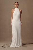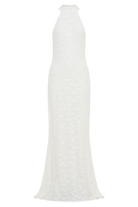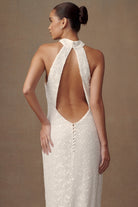Step into sophistication with the EMERY Lace Halter Maxi Dress, a stunning fusion of timeless elegance and modern allure. Boasting a halter neckline and a captivating open back, this dress exudes effortless charm. Delicately adorned with centre back button closure detailing, it adds a touch of vintage-inspired glamour. Lined with mesh for comfort and coverage, and featuring a flattering bodycon silhouette, it accentuates your curves with grace. Elevate your ensemble with the Emery dress, perfect for making a memorable statement at any event.