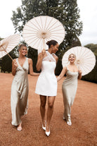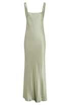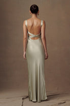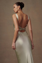 This is a sleeveless maxi dress with wide shoulder straps and a scooped neckline. Its back is a low, open affair with criss-crossed fabric straps around the base of the spine and clean, straight straps at the sides. Its custom satin fabrication paired with the invisible side zipper allows for a smooth, seamless silhouette. A fresh, flattering take on a classic cut, this dress is the perfect choice for an all-day outfit.
