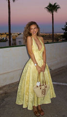 Embrace effortless elegance with the Esmeralda Halter Sleeveless Midi Dress, designed for both sophistication and comfort. Featuring a flattering halter V-neckline and a beautifully textured finish, this dress offers a timeless silhouette. Whether you're attending a special occasion or a chic daytime event, the Esmeralda dress is the perfect choice.