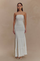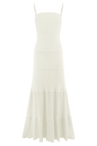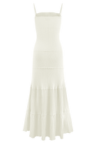 The FINLEY Pointelle Knit Maxi Dress is the perfect blend of delicate texture and timeless elegance. Designed for versatility, it can be worn with or without straps, offering a customisable look to suit any occasion. The slip dress silhouette drapes effortlessly, while a small ribbed waist panel subtly defines the shape. Scallop trim details inserted into tiered seams add a touch of femininity, enhancing the dress’s soft, flowing movement. Crafted in an unlined knit for a lightweight feel, this dress is a dreamy choice for sunlit days, romantic evenings, or effortless resort styling.