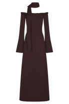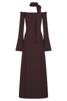 The HEIDI Strapless Knit Scarf Maxi Dress is a statement in sculpted elegance. Featuring a Bardot neckline and long sleeves with flared hems, this form-fitting silhouette gently flares into a fluid hem for graceful movement. Skirt paneling adds subtle structure, while the detachable scarf offers styling versatility—drape it, wrap it, or wear it your way. Perfect for cooler evenings or elevated daywear, this dress delivers modern femininity with a soft, statement-making twist.