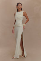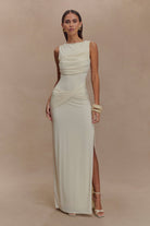 The HENLEY Slinky Drape Maxi Dress is a masterclass in understated glamour. Featuring a refined boat neckline, this bodycon silhouette drapes effortlessly across the bust and waist, creating a fluid, sculptural effect. The open-back design, secured with a delicate button closure at the top, adds a touch of allure, while a draped tie cascades elegantly from the right shoulder for a striking finish. Unlined for a lightweight, slinky feel, this dress is the perfect choice for evening sophistication, black-tie affairs, or modern bridal moments.