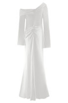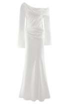 The IRIS Long Sleeve Satin Maxi Dress is a statement of refined elegance. Designed with an asymmetrical neckline and a gathered bust overlay, this silhouette drapes beautifully while enhancing the figure. The fitted, boned bodice provides structure and support, while the gathered hip detail adds soft dimension. A flowing maxi-length skirt completes the look with effortless grace. Finished with an internal elastic waist stay for a secure fit and a back zip with hook-and-eye closure, the Iris dress is perfect for formal occasions, black-tie events, and unforgettable moments.