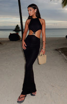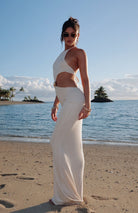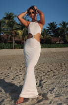 Breezy, flattering, and effortlessly refined—the Isla Coastal Maxi Dress is your warm-weather go-to. With a halter neckline, sleek waist cut-outs, and a soft white finish, it hugs the body before falling into a relaxed, flowing skirt. Perfect for beach days, summer getaways, and sunset dinners.