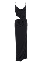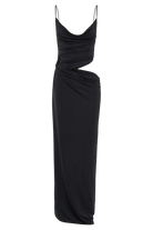 The JEMMA Draped Slinky Maxi Dress is a captivating blend of elegance and allure. It features a sophisticated cowl neckline and adjustable straps, allowing for a perfect fit. The asymmetrical draped waistline accentuates the silhouette, while a daring hip cutout adds a touch of modern edge. The asymmetrical hem enhances the flowing, graceful design of the dress. Fully lined for comfort, this maxi length dress is perfect for any special occasion where you want to make a stunning impression. The Jemma Draped Slinky Maxi Dress combines timeless sophistication with contemporary style.
