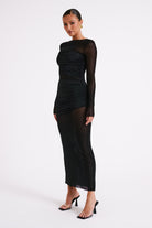 KATE is a long-sleeved maxi dress with a high, round neckline and asymmetrical fitted wraps. The fabrication is a visually stunning blend of matte jersey and black mesh. The mesh panels feature raw edge finish while the matte jersey panels boast asymmetrical cuts for a contemporary and artistic look. Both fabrics have a slight stretch that allows the dress a fitted, curve-hugging silhouette that’s both fashionable and flattering.