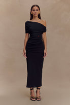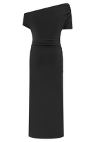 Own the spotlight in the KENDRA Scuba Jersey Midi Dress, a sculptural silhouette with elevated edge. Featuring an asymmetrical neckline and drop shoulder design, this dress is defined by its gathered shoulder and waist detailing that flatters the figure. Gold hardware accents add a luxe touch, while the fitted shape and midi length keep the look effortlessly refined. Unlined for a second-skin feel, this dress is your go-to for after-dark sophistication.