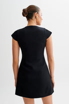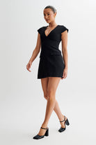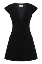 This is a sleeveless mini dress with a deep V-neckline, textured fabrication, and blazer details. Strikingly structured, this dress features a fitted bodice and A-line skirt for that classic suiting silhouette. Sewn-in shoulder pads paired with cap sleeves and a deep neckline add a powerfully feminine touch to a timeless cut. Contemporary details like faux flat pockets on the front and a cinched waistline further elevate this seasonal piece.