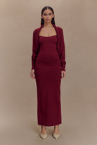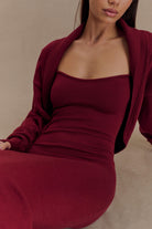 Meet the KINGSTON Knit Maxi Dress — a sleek, sculpted essential with a twist. Designed with slender straps and a straight neckline, this bodycon silhouette contours the body while offering effortless movement with a back vent and breathable, unlined finish. The removable bolero adds versatility, featuring slouchy-fit sleeves and a ribbed neckline for a touch of relaxed edge. Whether styled together or worn solo, Kingston is your go-to for easy sophistication with a modern mood.