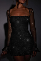 - Elegant Mesh Sleeves: The sheer mesh sleeves bring a chic, delicate contrast to the dress, adding a touch of subtle sophistication to the bold shimmer.