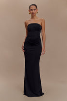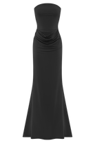 Command attention with the MADISON Strapless Slinky Maxi Dress, a stunning fusion of sophistication and allure. Featuring a rounded neckline and a sleek strapless design, this dress highlights your silhouette with its flattering bodycon fit. The maxi length and fishtail hem add a touch of drama, while the front draped skirt detail creates effortless movement and dimension. Fully lined for a smooth finish, this dress is the ultimate choice for evening soirées, galas, or any occasion where making a statement is a must.