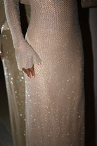 The MARCEL is a fitted maxi dress with a straight skirt and long sleeves. The off-shoulder neckline pairs perfectly with the fabric overlay over the bust, while the long sleeves have been designed to cinch to your arms before transitioning into flared hems around the wrist and palm. Adorned with rhinestones, MARCEL’s stretchable material promises both comfort and shimmer.