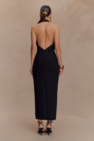 Make an unforgettable entrance in the MIERAH Halter Midi Dress, a statement silhouette with striking detail. Featuring an asymmetrical twisted neckline and cross-over back straps, this design highlights the décolletage while revealing a softly draped cowl back for a touch of allure. The fitted shape skims the body before flaring into a fishtail hem, creating graceful movement with every step. Fully lined for comfort and structure, this dress is your go-to for elevated evenings and special moments.