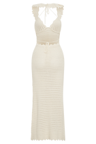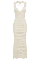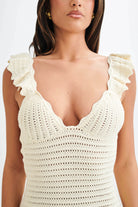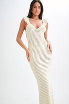 The PERPETUA Knit Contrast Maxi Dress is a stunning blend of elegance and intricate detailing. This bodycon dress features a V neckline and charming shoulder frill details that add a touch of femininity. The open back with adjustable straps offers a customisable fit and a hint of allure. Scalloped edging and crochet fabrication provide exquisite texture and visual interest, while the unlined design ensures a lightweight feel. With its midi length, the Perpetua Knit Contrast Maxi Dress is perfect for making a statement at any special event or casual outing.