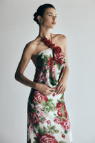 The ROSALIA Cowl Neck Maxi Dress is a captivating blend of elegance and romance. Featuring a deep cowl neckline and an alluring open back, this dress is designed to turn heads. Designed to have a soft draped fit around the neckline and soft fit body, the adjustable halter tie ensures a perfect fit, while the delicate chiffon rose applique detail adds a touch of whimsical charm. With its relaxed, drapey fit and floor-skimming maxi length, this dress is both effortlessly graceful and strikingly sophisticated.