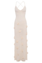 The SUKI Crochet Maxi Dress with Flowers features a V neckline and crisscross functional straps, exuding sophistication and grace. Its bodycon silhouette accentuates curves, while delicate flower appliqué adds a whimsical touch. Crafted from unlined knitwear, the flower crochet dress offers comfort and style for any occasion.