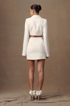 Step into sophistication with the TRINITY Crepe Blazer Dress, a refined ensemble that effortlessly combines elegance with contemporary allure. Boasting a V neckline and adorned with round collar detail, this dress exudes timeless charm with a modern twist. The double-breasted design adds a touch of refinement, complemented by functional buttons for versatility and style. With long sleeves for added sophistication and a back cutout detail for a hint of allure, the Trinity dress is the perfect choice for making a statement at any event. Complete with a mini length and non-functional button detail at the sleeve hem, it's the epitome of chic style for the modern woman.