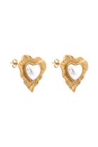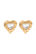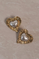 The HEART TO HEART Pearl Earrings are a perfect blend of romance and sophistication. Featuring gold organic heart shapes with a textured finish, these earrings are accented by delicate pearl hearts for a touch of charm. Designed with a stud post and butterfly back, they ensure a secure and comfortable fit. Perfect for adding a romantic touch to any outfit, these earrings are a must-have for your jewelry collection.