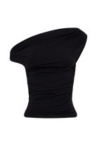 ALAYNA is an asymmetrical top with a straight-cut neckline and strategic ruching. Sewn from a custom blend of elastane and recycled nylon, its stretchy fabrication offers a fairly bodycon fit that highlights your curves. The ruching around the waist and arms further shapes and elongates the body, creating a universally flattering silhouette. Fresh and unique, this seasonal must-have can be worn as a solo feature or layered with a textured blazer.