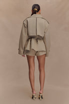 The ALDEN Short Trench Jacket offers a contemporary take on timeless outerwear. Designed with classic trench elements including shoulder epaulettes, raglan sleeves, a double breasted front, and a waist cinching belt, this cropped silhouette brings effortless polish to any look. Fully lined for comfort and structure, it features practical side pockets and functional belt loops for added versatility.
