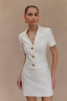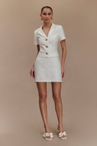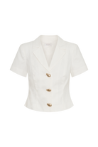 The Ciara Linen Jacket is a sophisticated staple that effortlessly blends tailored elegance with everyday versatility. Featuring a classic collared neckline and short sleeves, this fitted jacket offers a polished look with a button front closure that flatters your silhouette. Fully lined for comfort, the Ciara is perfect for layering over casual tops or dressing up for a night out. Pair it with the Ciara Linen Mini Skort for a chic ensemble that seamlessly transitions from day to night, making it a timeless addition to your wardrobe.