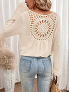 The Becky shirt offers breathable comfort, easy care, and retains its shape. It combines casual comfort with elegance through its relaxed fit and unique mandala-like back details. The cozy waffle texture and classic V-neck make it versatile and easy to style.