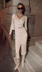 The Darcy Knitted V-Neck Midi Dress is a timeless blend of elegance and sophistication. Designed with a flattering fitted silhouette, a deep V-neckline, and striking golden buttons, this dress exudes effortless style. Crafted from soft stretch-knit jersey, it provides both comfort and a sleek, refined look for any occasion.