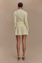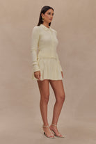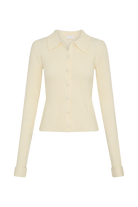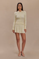 The ERIN Long Sleeve Button Cardigan is a classic piece reimagined with modern elegance. Crafted from soft knit fabrication with ribbed detailing, this cardigan features a button front and a collared neckline that exudes timeless sophistication. The long sleeves and longline cut offer both warmth and a flattering silhouette, making it a versatile layering option. Perfectly paired with the Dionne Pleated Knit Mini Skirt, the Erin Cardigan creates a chic and cohesive look that effortlessly combines comfort with style.