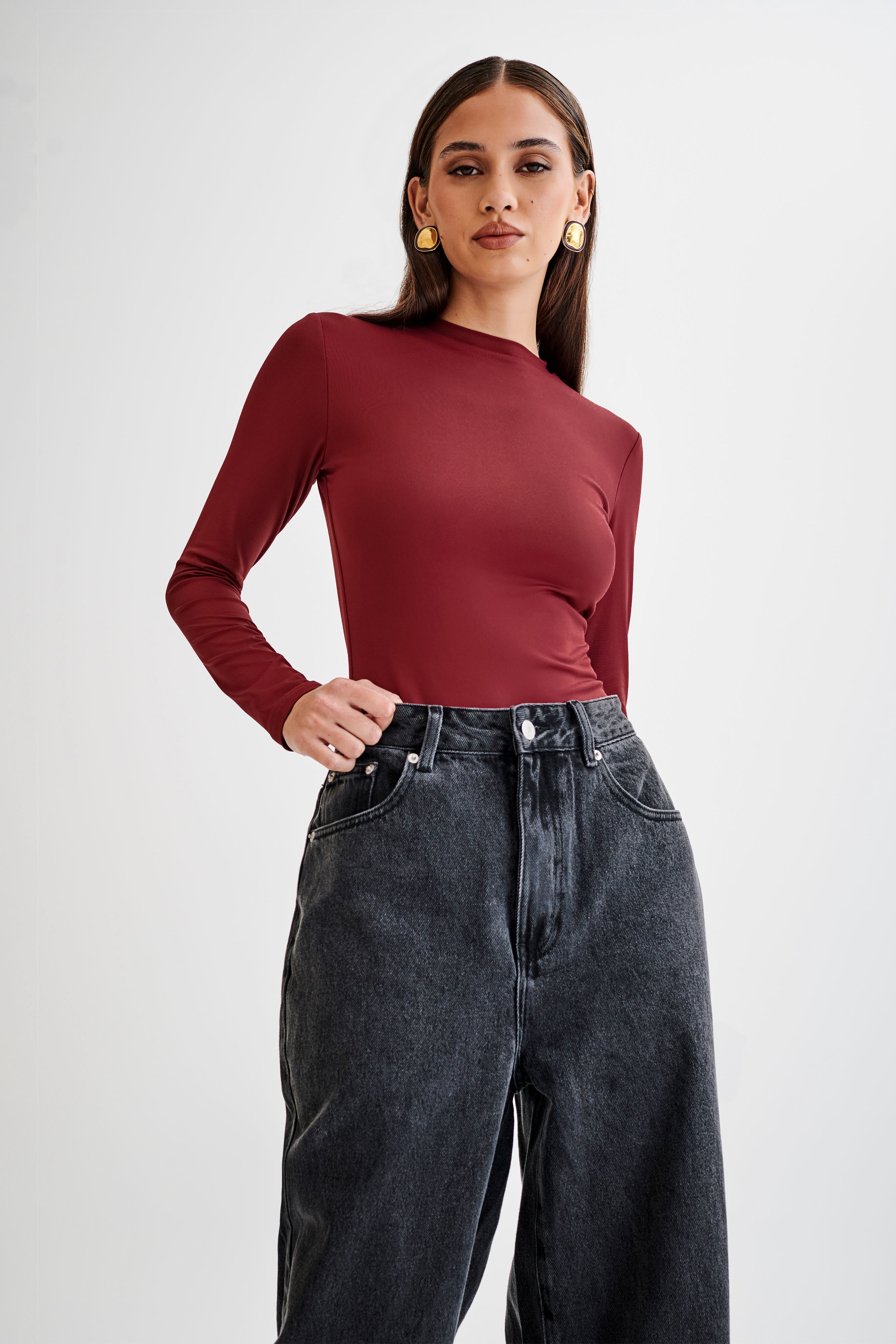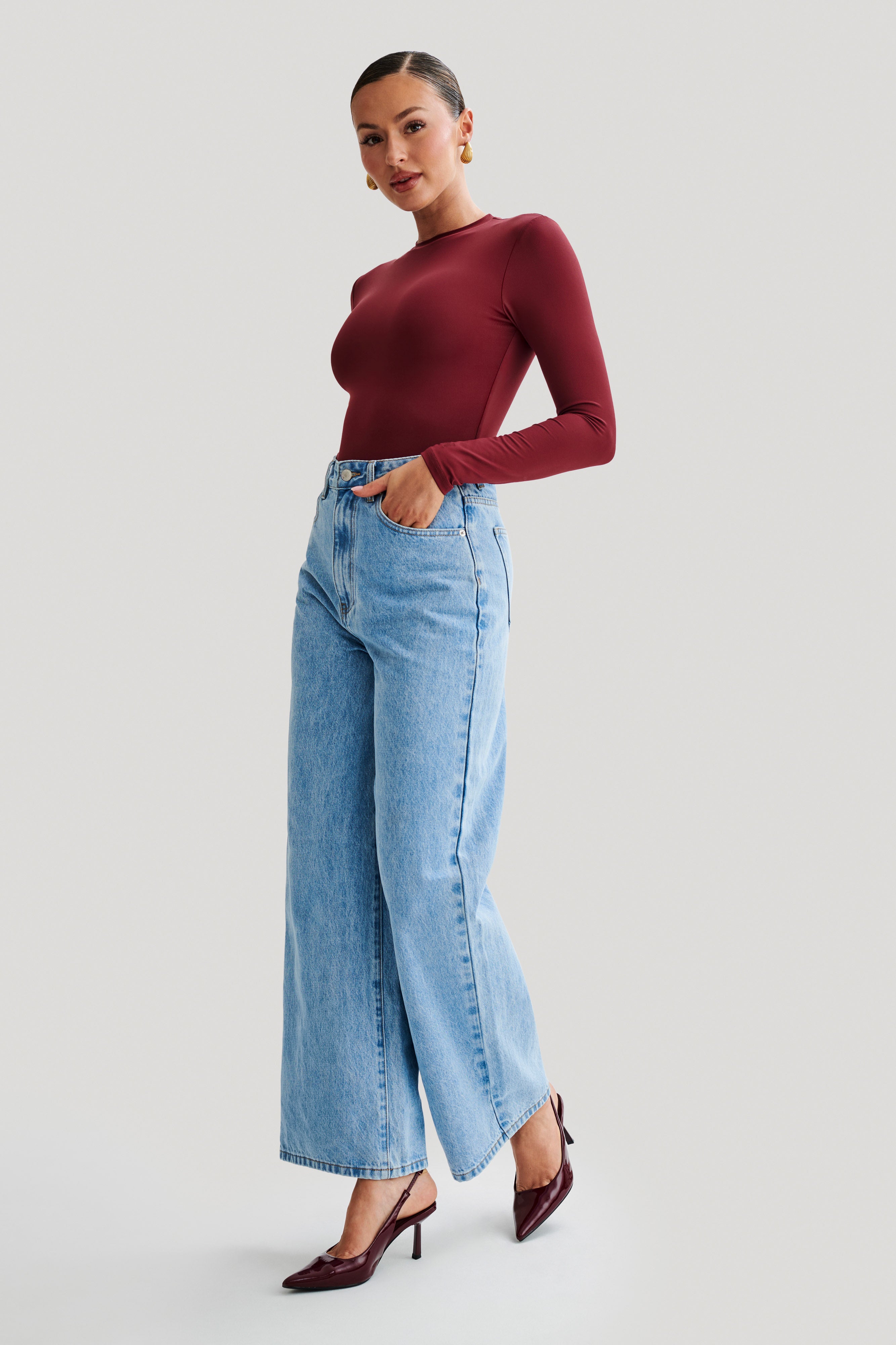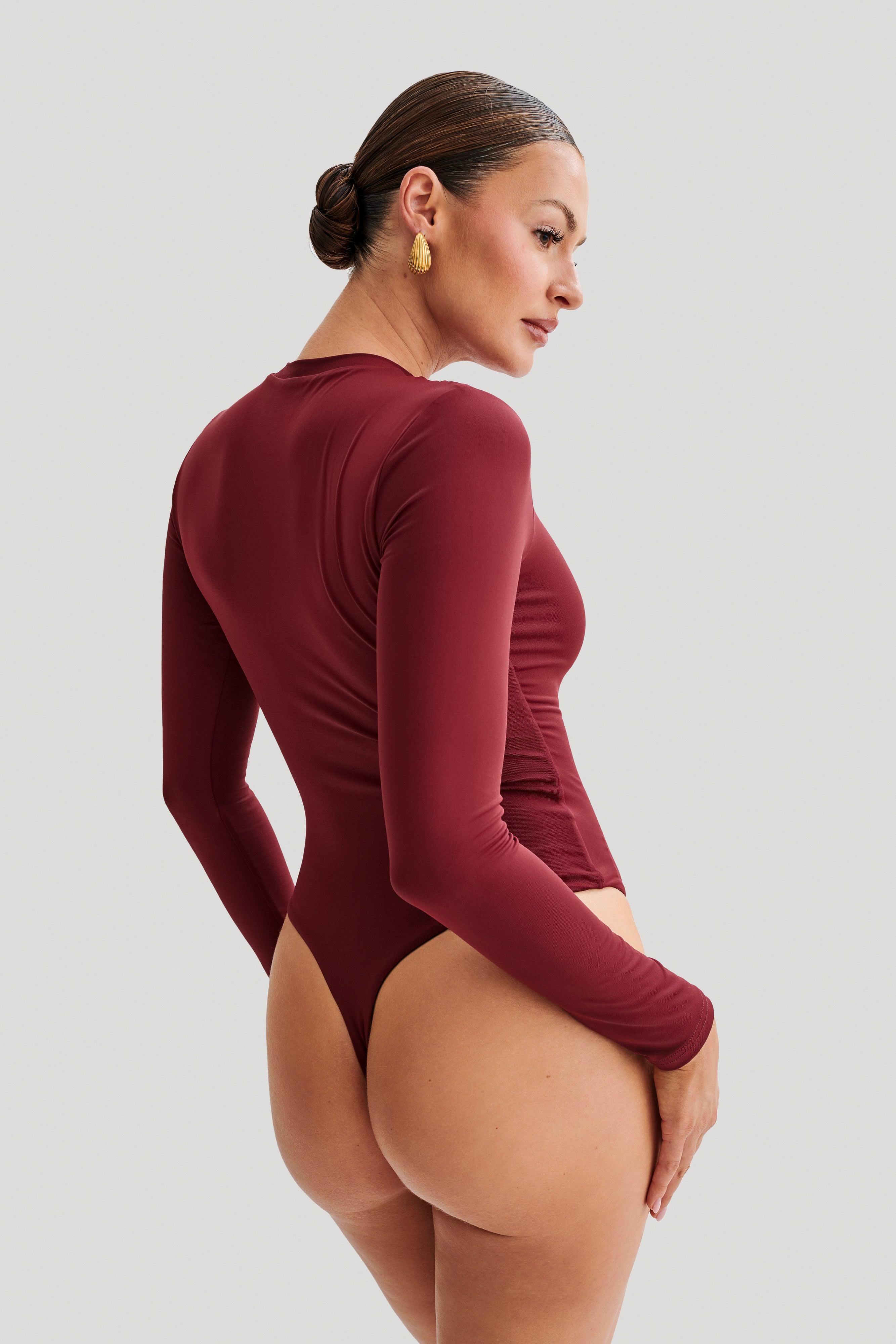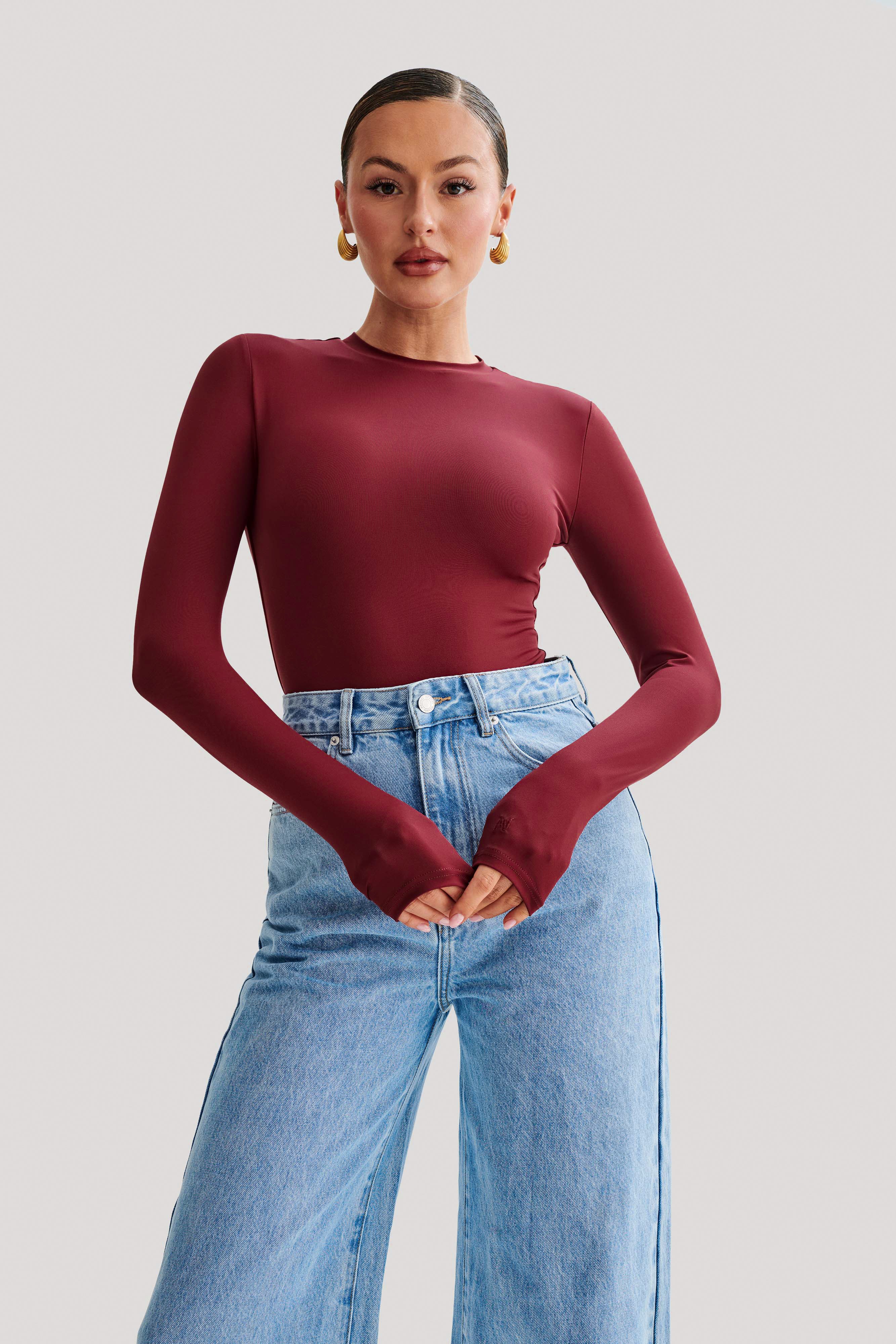 Delilah Recycled Nylon Long Sleeve Crew Neck Bodysuit - Wine