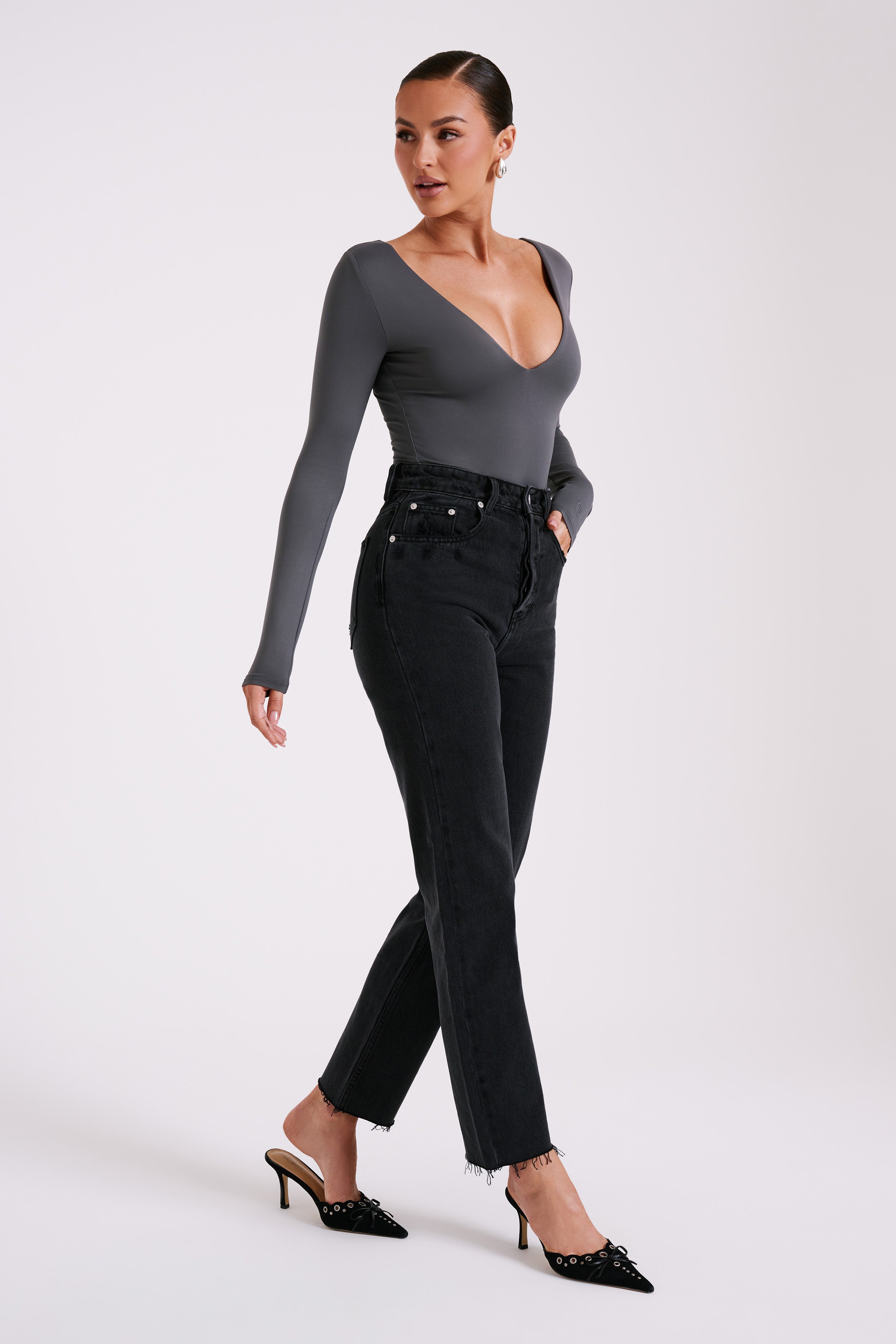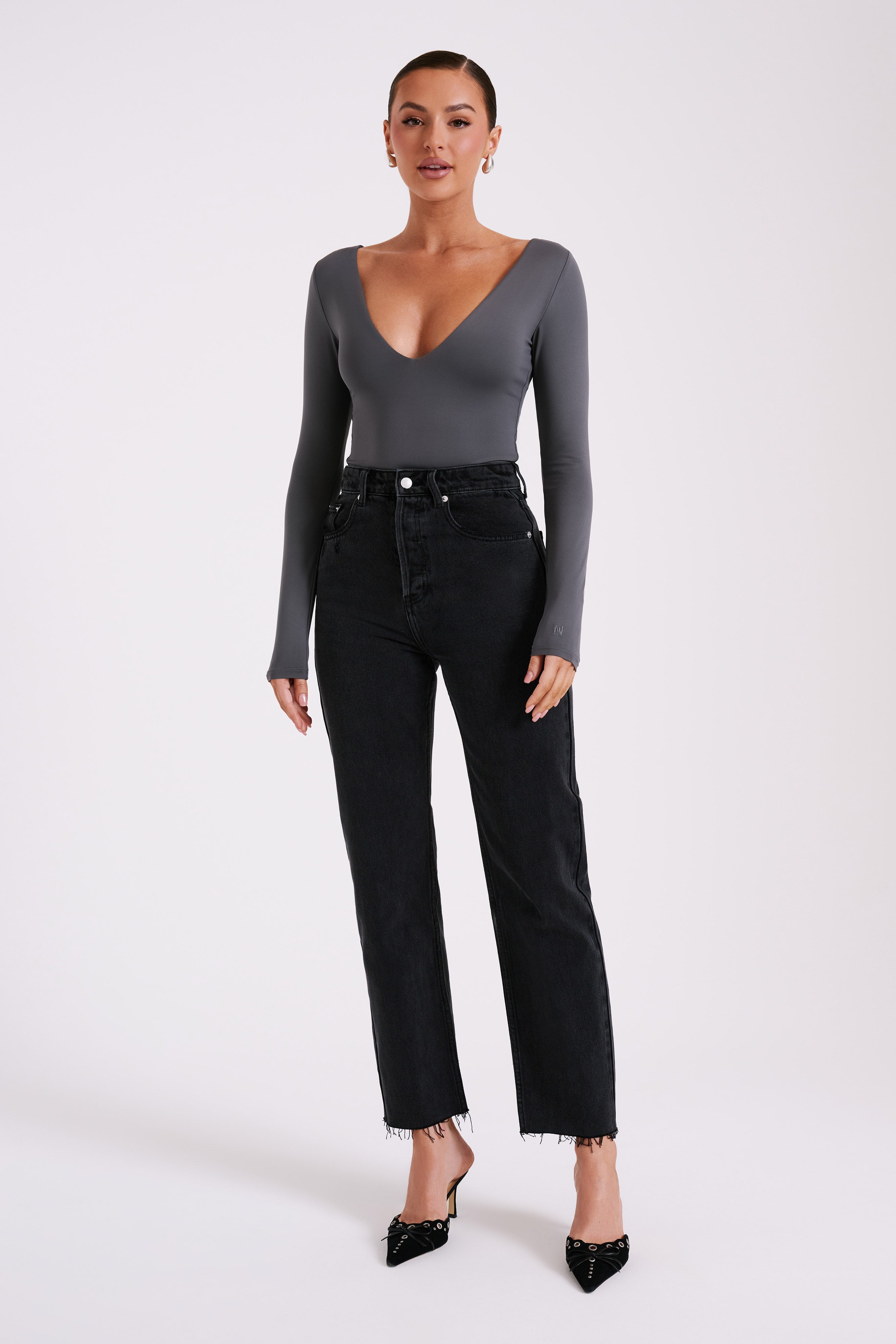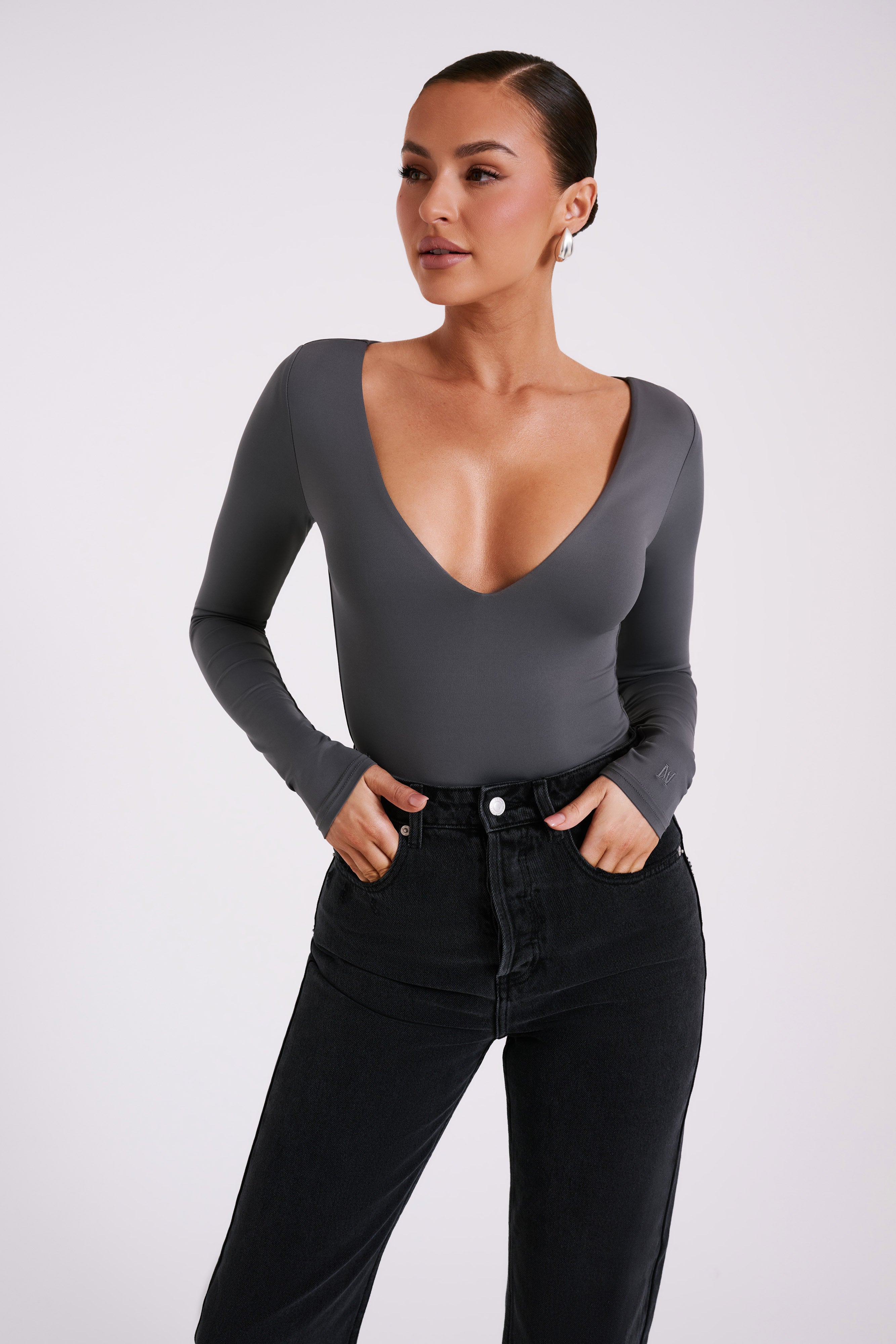 Nia Long Sleeve V Neck Bodysuit - Charcoal
