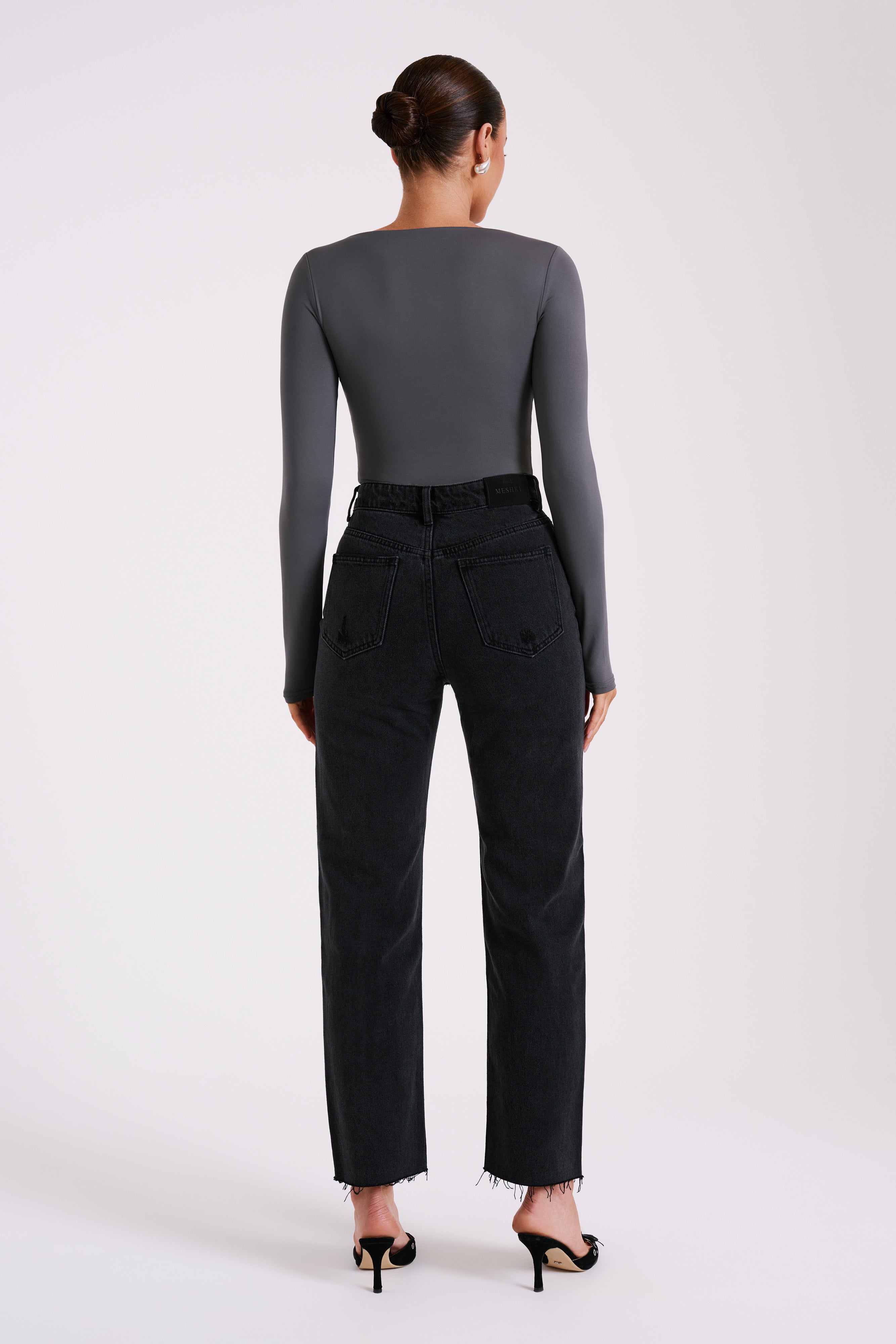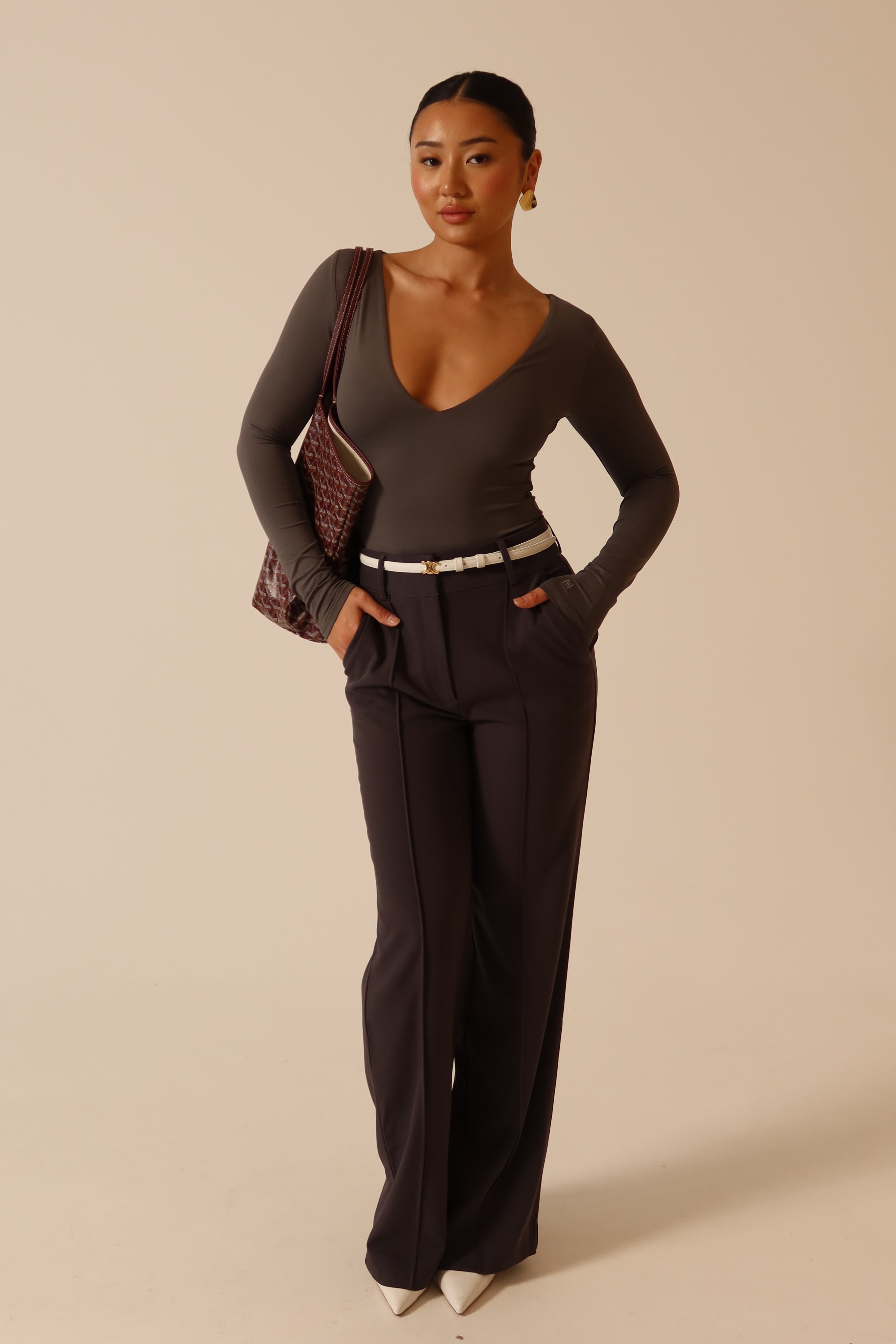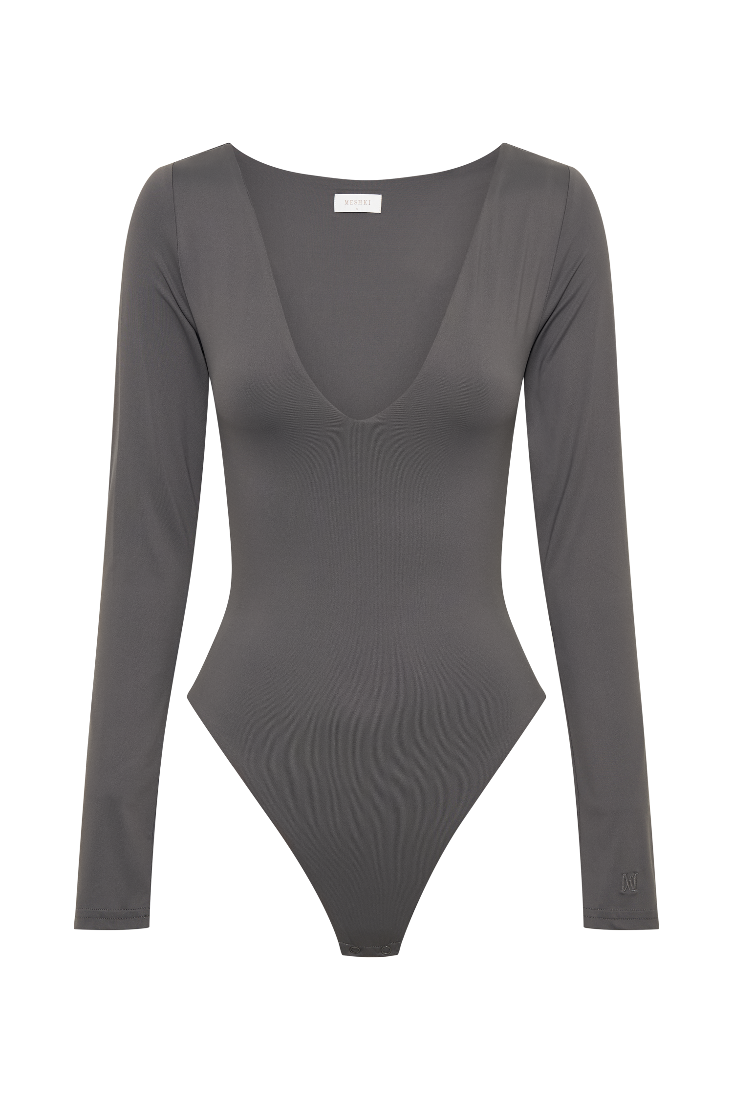Nia Long Sleeve V Neck Bodysuit - Charcoal