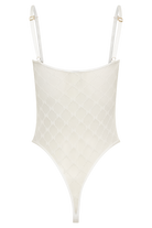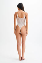 The AMELIA Monogram Bodysuit is a stylish and sophisticated addition to your wardrobe. It features a straight neckline and adjustable straps for a perfect fit. The mesh-lined bust and front panel seams enhance the bodysuit's sleek design, while the monogram mesh fabrication adds a touch of elegance. With functional snaps at the gusset, this bodysuit combines both fashion and convenience effortlessly.