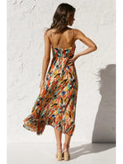 The stylish dress with a V-neck has a colorful pattern and a beautiful design, but has no sleeves. Combine this beautiful dress with neutral shoes such as black ballerinas or brown sandals to steal the show.