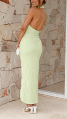 Introducing the Shyann - Elegant Pleated Dress! This exquisite dress features a high neckline, an open back, and a graceful front crossover, perfect for making a statement at any event. The pleated fabric adds texture and depth, while the asymmetrical design enhances its sophisticated allure. Ideal for evening occasions, the Shyann dress pairs beautifully with minimalist accessories, ensuring you captivate with elegance and style. Elevate your wardrobe with this timeless piece!