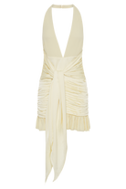 The AMBROSI Satin Chiffon Mini Dress is a stunning and sophisticated choice for any special occasion. This dress features a plunging deep V neckline and a chic halter style, creating a glamorous and elegant look. The ruched hip panel enhances the dress's flattering fit, while the delicate hem frill and tie overlay add a touch of playful femininity. With a centre back invisible zip and hook & eye closure for a flawless finish, this mini-length dress combines luxury and allure in one captivating design.