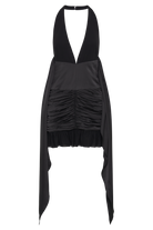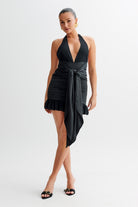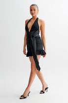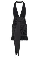 The AMBROSI Satin Chiffon Mini Dress is a stunning and sophisticated choice for any special occasion. This dress features a plunging deep V neckline and a chic halter style, creating a glamorous and elegant look. The ruched hip panel enhances the dress's flattering fit, while the delicate hem frill and tie overlay add a touch of playful femininity. With a centre back invisible zip and hook & eye closure for a flawless finish, this mini-length dress combines luxury and allure in one captivating design.