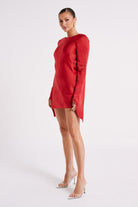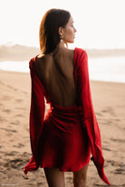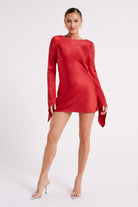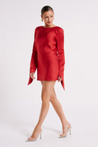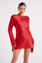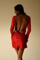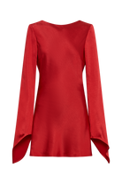 This satin mini dress features a low, open back, a high boat neckline, and asymmetrical bell sleeves. A back cowl adds visual texture to the seamless finish. Fresh, fun, and flirty, its smooth, lined fabric is as comfortable as it is flattering. Pair it with our Brandy Ankle Strap Heels for an ultra-chic look.