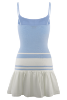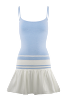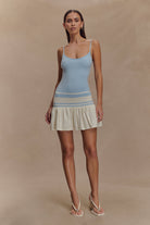 The ELLISON Contrast Knit Mini Dress is your go-to for flirty, fun styling with a modern twist. Featuring a scoop neckline and striking back cross-strap detail, this fitted silhouette hugs the body before flaring into a frilled lower skirt. Bold contrast stripe detailing adds a graphic edge, while the unlined knit keeps it light, breathable, and ready for warm-weather days. this dress is perfect for weekend plans, sunlit strolls, and everything in between.